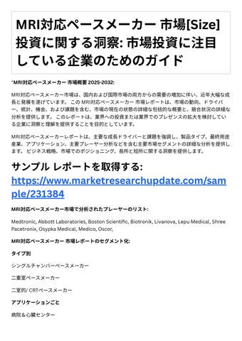 MRI対応ペースメーカー市場は、国内および国際市場の両⽅からの需要の増加に伴い、近年⼤幅な成 ⻑と発展を遂げています。この MRI対応ペ スメ カ 市場レポ トは、市場の動向、ドライバ ー、統計、機会、および課題を含む、市場の現在の状態の詳細な包括的な概要と、競合状況の詳細な 分析を提供します。このレポートは、業界への投資または業界でのプレゼンスの拡⼤を検討してい る企業に洞察と理解を提供することを⽬的としています。