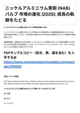 主要マ ケットプレ ヤ による主要事業戦略とその主要⼿法 調査レポートは、グローバルおよび地域レベルでのニッケルアルミニウム⻘銅 (NAB) バルブ 市場の規模、シェア、傾向、および成⻑分析を網羅しています。