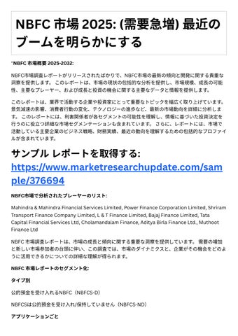 NBFC 市場調査レポートは、市場の成⻑と傾向に関する重要な洞察を提供しています。需要の増加 と新しい市場参加者の台頭に伴い、この調査では、市場のダイナミクスと、企業がその機会をどのよ うに活⽤できるかについての詳細な理解が得られます。