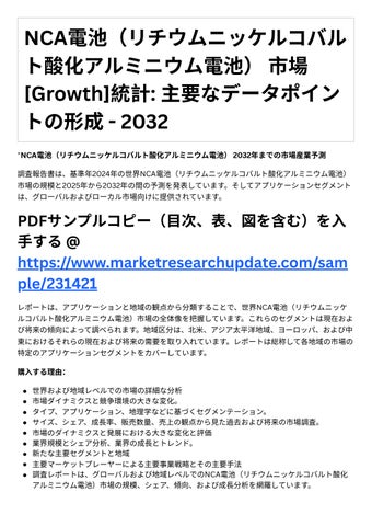 新たな主要セグメントと地域 主要マーケットプレーヤーによる主要事業戦略とその主要⼿法 調査レポ トは、グロ バルおよび地域レベルでのNCA電池(リチウムニッケルコバルト酸化 アルミニウム電池)市場の規模、シェア、傾向、および成⻑分析を網羅しています。
