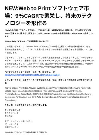 この調査レポ トには、Web to Print ソフトウェアの市場で上昇している技術も描かれています。 市場の成⻑を後押しし、グローバル市場で成功するための積極的な推進⼒を与える要因について詳し く説明します。