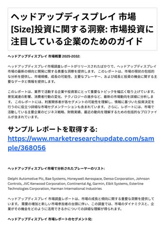 4. 投資機会: レポ トは、成⻑の可能性や競争環境など、ヘッドアップディスプレイ市場における投 資機会に関する情報を提供します。