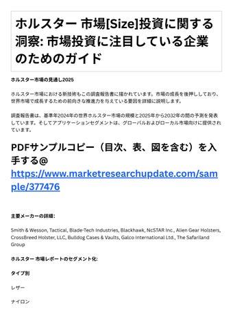 レポ トは、アプリケ ションと地域の観点から分類することで、世界ホルスター市場の全体像を把 握しています。これらのセグメントは現在および将来の傾向によって調べられます。地域区分は、北 ⽶、アジア太平洋地域、ヨーロッパ、および中東におけるそれらの現在および将来の需要を取り⼊れ ています。レポ トは総称して各地域の市場の特定のアプリケ ションセグメントをカバーしていま す。