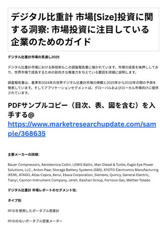 市場のダイナミクスと発展における⼤きな変化と評価 業界規模とシェア分析、業界の成⻑とトレンド。 新たな主要セグメントと地域 主要マーケットプレーヤーによる主要事業戦略とその主要⼿法 調査レポ トは、グロ バルおよび地域レベルでのデジタル⽐重計市場の規模、シェア、傾 向、および成⻑分析を網羅しています。