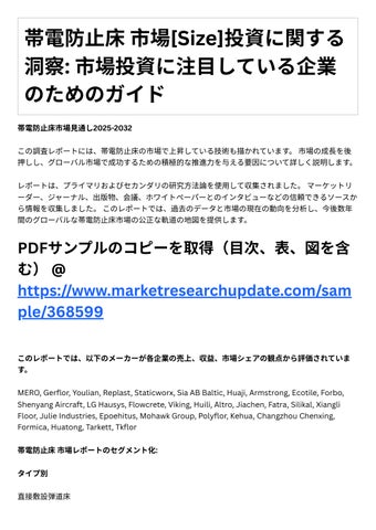 レポ トは、プライマリおよびセカンダリの研究⽅法論を使⽤して収集されました。マーケットリ ダ 、ジャ ナル、出版物、会議、ホワイトペ パ とのインタビュ などの信頼できるソースか ら情報を収集しました。このレポートでは、過去のデータと市場の現在の動向を分析し、今後数年 間のグロ バルな帯電防⽌床市場の公正な軌道の地図を提供します。 PDF