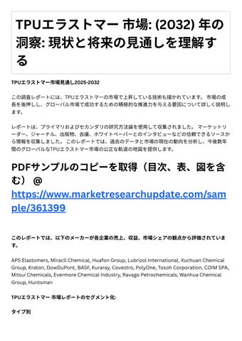 この調査レポ トには、TPUエラストマ の市場で上昇している技術も描かれています。市場の成 ⻑を後押しし、グロ バル市場で成功するための積極的な推進⼒を与える要因について詳しく説明し ます。