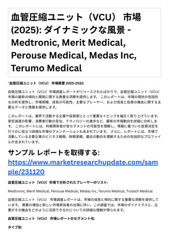 ⾎管圧縮ユニット(VCU)市場概要 2025-2032: ⾎管圧縮ユニット(VCU)市場調査レポートがリリースされたばかりで、⾎管圧縮ユニット(VCU) 市場の最新の傾向と開発に関する貴重な洞察を提供します。このレポ トは、市場の現状の包括的 な分析を提供し、市場規模、成⻑の可能性、主要なプレーヤー、および成⻑と投資の機会に関する主 要なデータと情報を提供します。