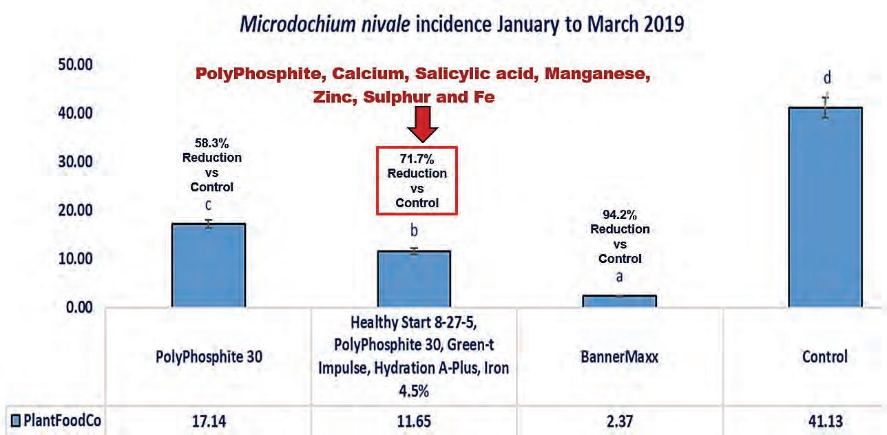A program containing Phosphite, Calcium, Salicylic acid, Manganese, Zinc Sulphur, and Chelated Fe suppressed Microdochium incidence by 72% compared to Controls.
