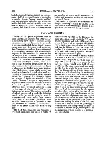 FEEDING Further items reported in the literature include Ctenosaura similis similis in L. f. yucatanensis (Barbour and Cole, 1906) and Pternohyla fodiens in L. s. polysticta (Firschein, 1951). Captive specimens feed on small frogs and lizards. Ditmars (1945) reported that captive L. s. septentrionalis ate mice. This is, so far as I know, the only report of Leptodeira feeding on warm-blooded prey. Observations were made on feeding habits of captive L. f. frenata, maculata, punctata, s. ornata, and s. polysticta. All these were fed frogs. When small frogs were placed in the cage the snakes would grab hold of one, usually quickly work to the head, and swallow the frog in much the same manner utilized by Thamnophis or Natrix. Sometimes the frog was still alive during the swallowing process, which indicates that with small prey the snake may not engage the enlarged, grooved fangs and inject venom. With larger frogs the snake strikes, grabs hold, and rapidly chews, opening its mouth widely until the enlarged, grooved fangs are engaged. Then it holds the prey until movement stops. The lenigth of time necessary for the venom to take effect varies with the size of the snake and that of the frog; however, on the basis of my limited observations two to five minutes seem to suffice for most frogs. Data on the effect of the venom on large frogs and lizards are lacking. In view of the fact that the venom of several species of opisthoglyph colubrids is of sufficient potency to result in the death of human beings, investigations of the properties of these venoms is of considerable importance.