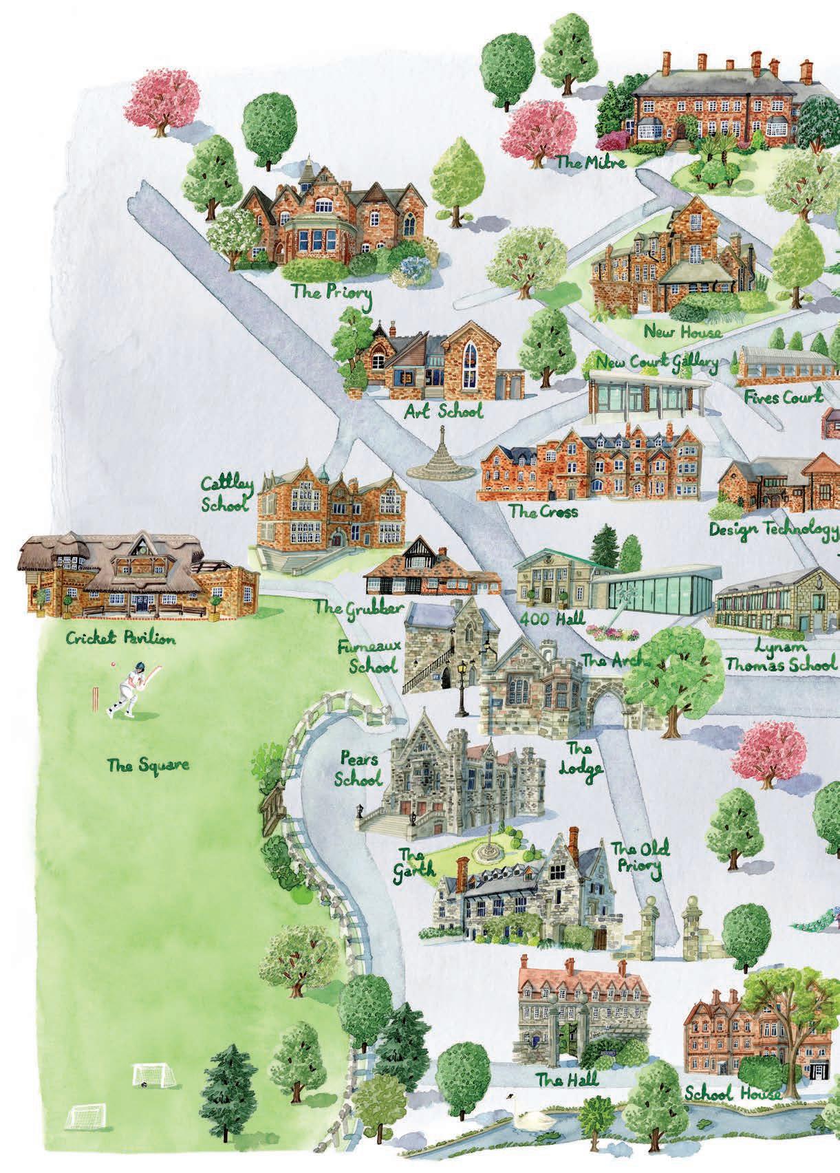 at liberty to ‘lye his cowes in the lower roome under the Schoole’. The School’s Undercroft remains but with fewer bovine visitors; today it is where teachers, tutors, Housemasters and Housemistresses join the Headmaster for coffee and notices and pupils gather for various societies.