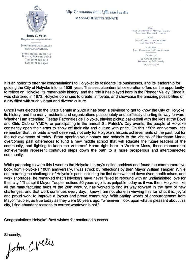 It is a special pleasure for me to join with people across the city in extending congratulations on Holyoke’s 150th birthday celebration.