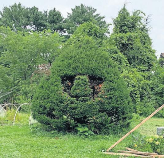 Facing my kitchen window is another yew, a large one that was planted way before I got here. Its previous caretaker and, up to recently I, have maintained it as a large, rounded cone. Last year I decided to make that rounded cone more interesting, copying a topiary in Britain. The design is in its early stages, awaiting some new growth this year to fill in bare stems now showing in interior of the bush.