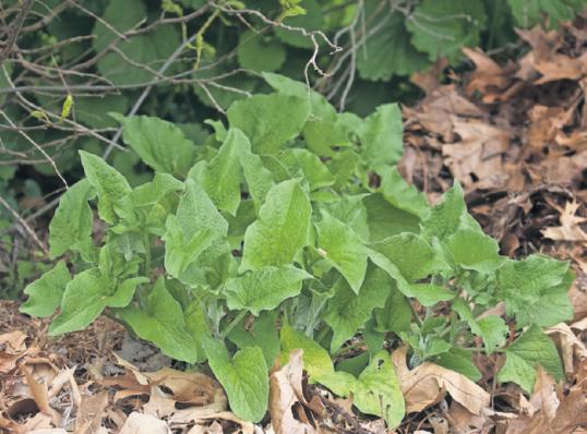 The bed that’s home to Caucasian mountain spinach is also home to another perennial bit of edible greenery, Good King Henry (Blitum bo-