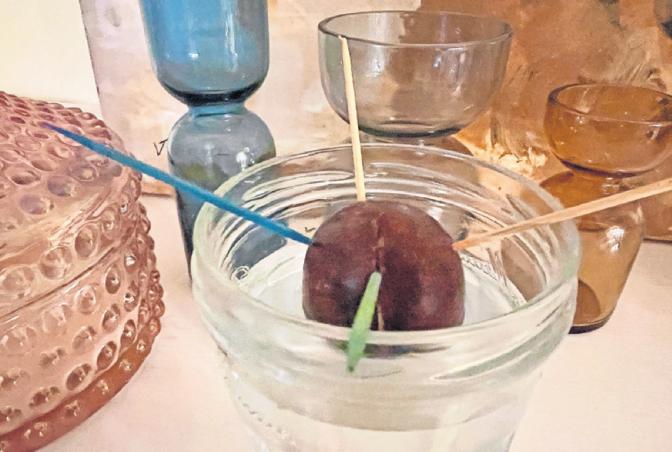 2. Insert four wooden toothpicks around the center of the seed to create crutches for it to rest on the rim of a glass or glass jar. Place the toothpick-adorned pit on the glass and fill it with water to toothpick level, sub -