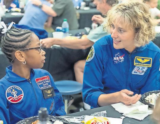 The New England Air Museum will host a Space Expo on April 25, from 9 a.m. to 3 p.m., with hands-on fun and experiments for the whole family to enjoy. Special guest, retired NASA astronaut Dottie Metcalf-Lindenberger, will host talks and meet and greets throughout the day. All Space Expo activities are free with museum admission. Above, Metcalf, at right, is shown talking with Bria Jackson, of Atlanta, who was attending Space Camp in Alabama in 2018. (ASSOCIATED PRESS, FILE PHOTO)