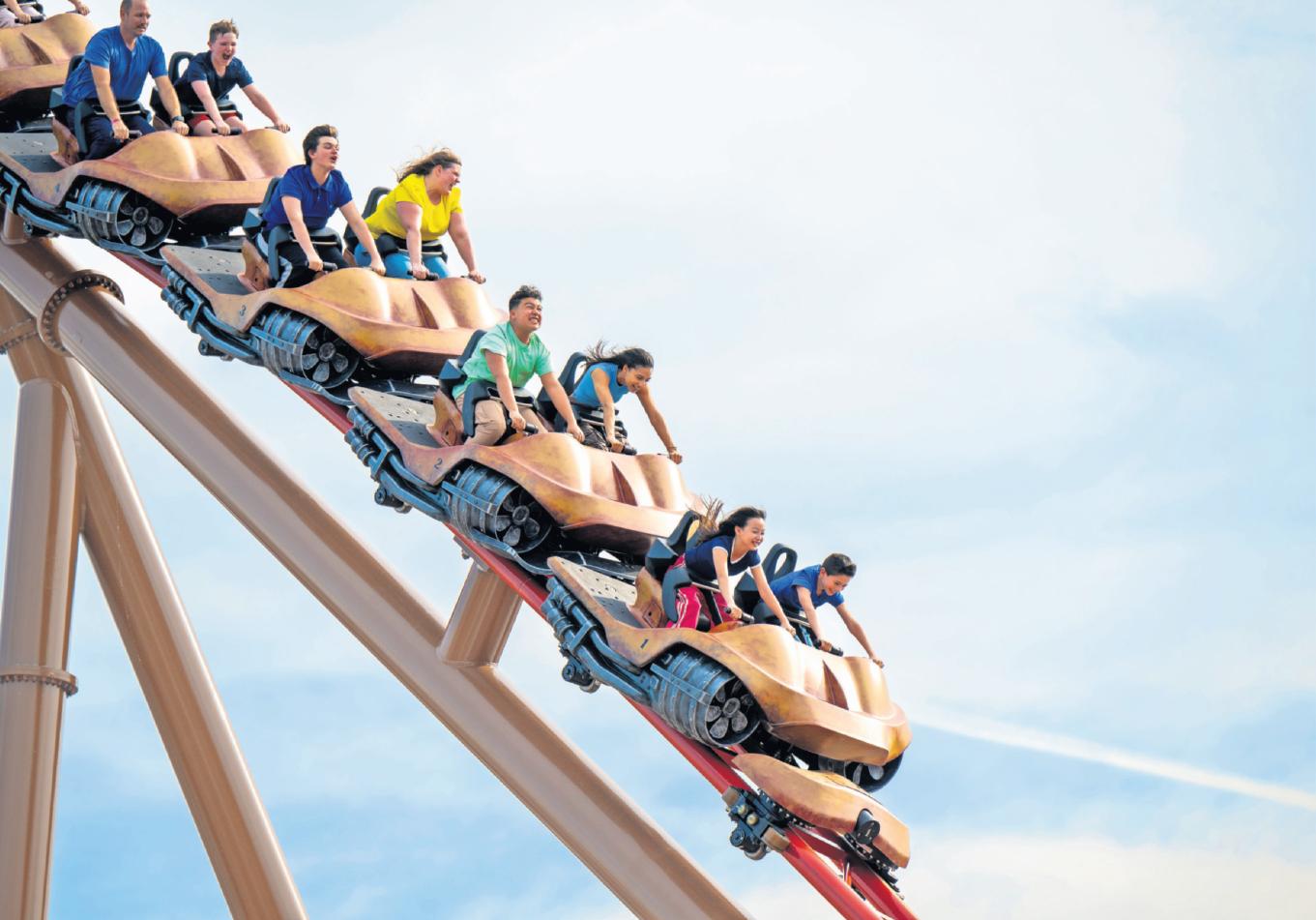 The train rides over the loading station, reaching a height of 59 feet, with high-speed twists and turns. Guests of the park can find the ride at Crackaxle Canyon.