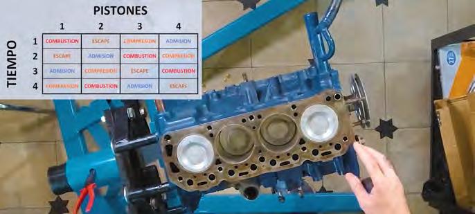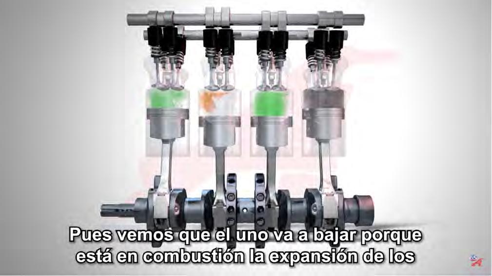 En la imagen los pistones 1 y 4 están en PMS y los pistones 2 y 3 en PMI muestran cómo están los pistones y el tiempo. El pistón 1 que está en PMS está en combustión y el 4 también está en PMS, ambos harán su carrera hacia PMI, el 1 en trabajo y el 4 en admisión.