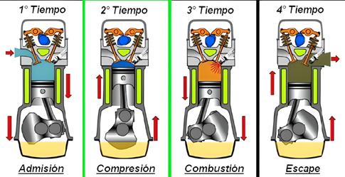 La admisión es cuando el pistón estando en PMS desciende, por lo que se abre la válvula de admisión y esto permite el ingreso de la mezcla de aire y gasolina al cilindro. Mientras tanto, la válvula de escape está cerrada.