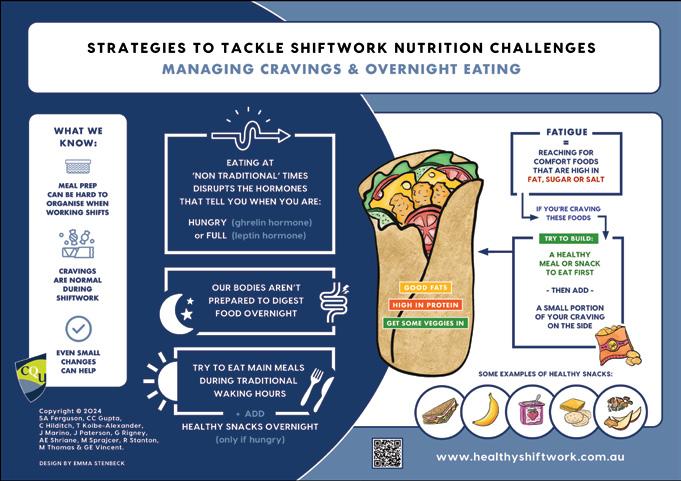 Shiftwork, a free suite of evidence-based tools to help shiftworkers manage sleep, nutrition, and physical activity. Hosted at www.healthyshiftwork.com.au , the free resources include website content, animated videos, infographics, and social media. From tips on napping effectively, when to consume caffeine on shift, to choosing what to eat on night shift, the resources are grounded in scientific evidence but designed specifically by shiftworkers for shiftworkers.
