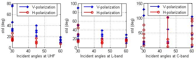 stepper motor system. With this movement, radar synthetic aperture data will be collected at every angle, and then SAR images will be formed for different multiple targets to accurately detect and classify them. In the literature, most of the foliage radar systems are operated with a narrowband signal, within 100MHz and 6GHz, to analyze the foliage attenuation profile, and backscatter statistics, detect the target, and construct the SAR images [44]. The good penetration and highrange resolution ability of UWB radar make it more suitable than narrow-band radar for the purpose of target detection. The standard deviation (std)in the phase error, as determined throughout a series of collection path angles of 30°, 45°, and 60°, is depicted on the graph in Fig. 3. Three frequencies' phase errors: UHF, L-band, and C-band are indicated in Fig. 3 for both horizontal and vertical polarizations [45]