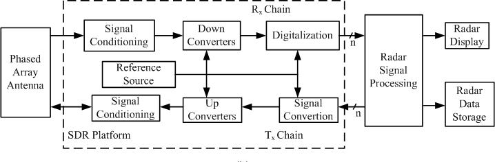 This radar system will be the search for fixed and moving man-made targets concealed by greenery was examined. Finding moving targets amid dense vegetation is a challenging endeavor. This is because, in a reconstructed SAR image, the image of a moving target is combined and weak in comparison to the SAR image of the nearby stationary foliage [81]. Additionally, the foliage has a potent coherent signal that, in the frequency domain, overlaps with the target signature becomes difficult to filter out. Therefore, operating radar at different frequencies is mandatory which is achieved by the software-defined platform. The main function of the software-defined radar platform in this work is pattern synthesizing for beam forming and waveform generation and signal conditioning. This platform consists of pre-filtering, mixing, analog to digital converter, digital to analog converter, baseband pre-processor, and I&Q signal generator. All these operations happen in the digital domain at greater resolutions and can be driven by the software. This platform is a fully digital frontend for both Tx and Rx chains, thus, it reduces the requirements of several RF components in the analog front-end section, hence, the overall systemvolume drasticallycomes down. Further, the baseband processing inthis platformis the waveform design, PRF selection, bandwidth selection, and center frequency selection by the driver software without any change in the physical architecture/structure. The input (X) to this platform is given by the cognitive architecture which processes the outputs (I[n] & Q[n] and even the raw data) of this platform [82].