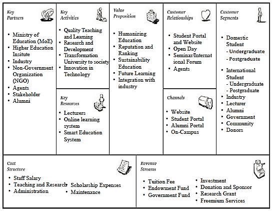 community engagement activities to the youth. This paper shall focus the youth community in Bandung, Indonesia. The new business model of MyUni is established with the vision of becoming a global university of educational excellence in human talent for the community, businesses and industries [3]. As changes are taking place, universities need to find out what should they do to attract students for quality and relevant education. Thus, this paper will provide a conceptual business model - a new BMC (Business Model Canvas) and VPC (Value Proposition Canvas) that will illustrate what the university should focus on. Ultimately MyUni will have better sight of the future and is always relevant to the people, businesses, and nations.
