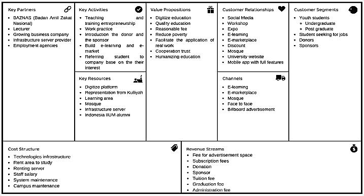 Revenue Streams describes how organizations earn money from each customer segment. Based on [27] in Oregano State University, on campus attendance graduate students cost around $29.739 - $39.336 but for online attendance the cost is around $528 - $777 per credit. Amount of revenues can be gathered from the online education platforms. The tuition fees and graduation fees paid by the students. And another extra from advertising sponsor in campus or online platform. By making a partner who is ready to help in terms of funds namely is Badan Amil Zakat Nasional (BAZNAS), Subscription fees of entrepreneurs and individuals but no fees for entrepreneurs from poor family.