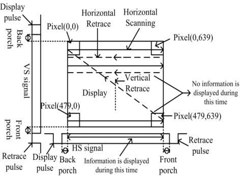 (R0R1R2G0G1G2B0B1B3) has possible values ranging from "000000000" to "111111111." In the DAC setup, a VGA driver DAC IC connects the VGA connection to the FPGA (ADV7123). The ability to send 0 through 255 various colors into each RGB pin with the aid of this driver IC allows for a more accurate presentation of ocular pictures. The VGA port's additional two pins (HS and VS) are directly linked to the FPGA [60,61]. The RGB pins can only be programmed with the standard code, "000" through "111," thus if we want to draw graphics with many colors, we must use a current divider circuit or a video DAC device (ADV7123). The start and finish of a line (left to right) and the frame (top to bottom) pixels are controlled by the HS and VS, respectively. As the picture is being displayed, the scanning, also known as horizontal scanning, must be begun from row 0, column 0, or the top left corner of the screen and moved to the right until it reaches the final column. As demonstrated in Fig. 8 by the dotted lines, as the scan reaches the row's last pixel, it returns to the start of the subsequent row and continues scanning there. Returning to the beginning of the subsequent row is the procedure's official name retrace. The scanning procedure is repeated once it reaches the last pixel, which is the one in the bottom right corner of the screen, by going back to the pixel in the top-left corner from which it started. The refresh rate, often known as the rate at which the entire screen is updated, must be at least 60 times per second [65-68]. The HS and VS signals regulate the entire scanning operation. The color of a pixel at a certain point on the screen is controlled by the combined video signals or RGB. Theyhave voltages ranging from0.7 to 1 V and are analog signals. The video color must be turned to black for the duration of the retrace time. the period before beginning the HS/VS retrace of the front porch, or right/bottom edge ofthedisplayregionis called a pulse. Similartothebackporch,thedisplayregion's left/topborderisformed bytheblanking interval that follows the application of the HS/VS. The video signal has to be turned off in these areas. The design settings that are required to display the image on the screen are all displayed here. Because it takes time to move back to the left and start moving ahead on the next row after applying the HS retrace pulse, we must wait a particular amount of clock before transmitting the pixels value to the screen. For instance, when the beam advances, we must count the horizontal pixels up to 640 and then wait a certain length of time after the 640th pixel. In other words, front porch time, and then state the HS. The VS control signal follows the same rules. One counter may be used to track a location's horizontal position, and the other counter can track a location's vertical position. The vertical counter should increment once for every complete horizontal scan, while the horizontal counter should count to 25MHz clocks. The time synchronization module creates the