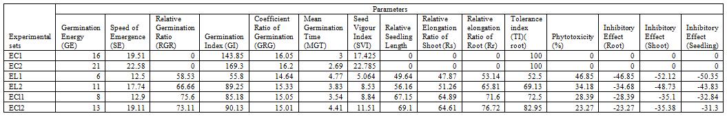 Apart from germination percentage, a number of indices have been considered by researchers to study the inhibitory effect of phytotoxic substances on germination process (Anjum and Bajwa 2005). Germination index (GI) is directly correlated with germination percentage. Thus greater the value of GI, the greater will be germination percentage. SVI is an important parameter to determine the potentiality of plant germination and growth. Germination energy, speed of emergence, germination index, coefficient ratio of germination and seed vigour index of all the extracts treated sets decreased as compared with control sets. The speed of the germination was expressed by the mean germination time; the lower the value of the MGT the earlier the germination. But mean germination time and phytotoxicity were increased in all the treated sets. Moreover, relative germination ratio, relative seedling length as well as relative elongation ratio of root and shoot in different extracts treated sets exhibited distinctive values. Maximum tolerance index were observed in control (100.00%). But Tolerance index was highest in ECl2 set considering only extract treated sets. Inhibitory effect was more in EL1 set for root, shoot as well as seedling growth. Among extract treated sets, GE, SE, GI, SVI and Relative seedling length were maximum in ECl2 set, whereas lowest values were obtained for EL1 set. But RGR was highest in ECl1 set (Table 2).