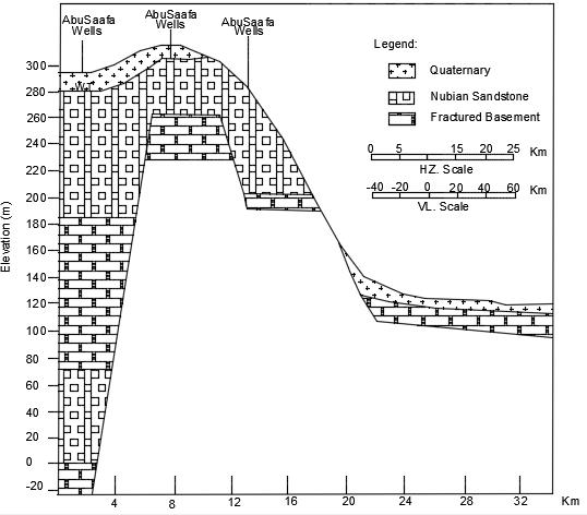 Figure 3: Hydrogeological cross section at AbuSaafa Wells location (Ismail, El Sayed, & Gomaa, 2006)