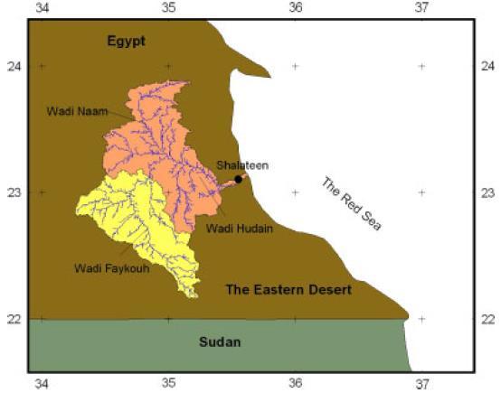 Wadi Hodein is in the southern part of the eastern desert of Egypt, between latitude 220000000, 240000000 N and longitude 340000000, 360000000 E and it covers an area of 11595 km2. Wadi Hodein is considered one of sub catchment of Red sea mountain which drains its runoff water toward Red sea as shown in Figure 1. It is situated in semi-arid to arid region with max rainfall of 10 mm between October to December and almost zero at the rest of the year. The maximum temperature reaches to 37.5 C0 in July and August while the minimum value reaches to 14 C0 in December and January. The Humidity reaches its minimum value of 29% in July and August and the average wind velocity in the study area reaches to about 12 km/hr. (Hassan, et al.2017)