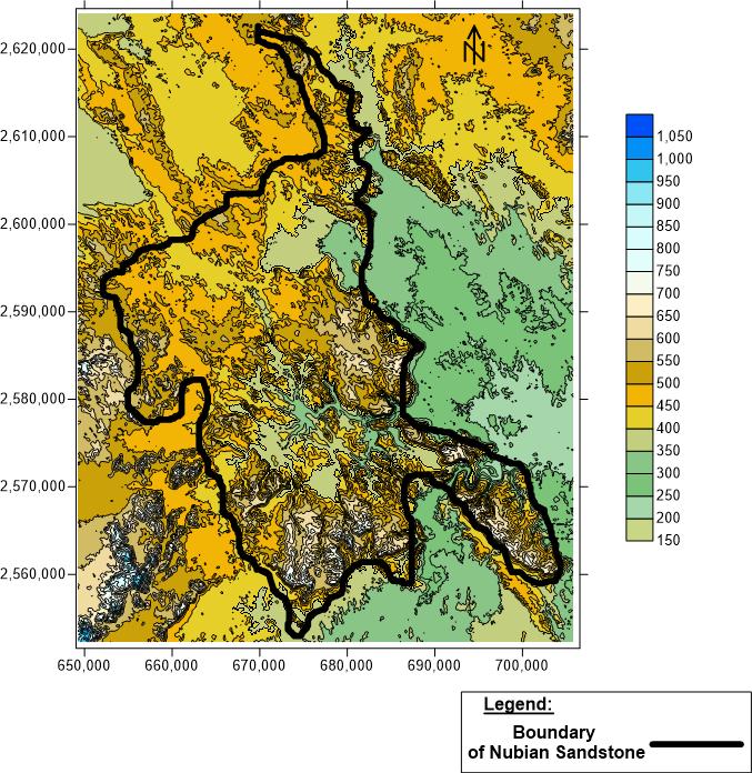 Many authors investigated the thickness of NSA at different drilled wells. (Ismail, et al.2006, found that water bearing formation of NSA was deteced in Wadi Abraq, Abu Saafa and Wadi El Dif where thickness of NSA at Wadi abu Saafa is about 150m. (NWRC, 2011) stated that thickness of NSA at Wadi Deif is from 32 to 134m. (Gomaa, et al.2001) mentioned that water bearing formation of NSA at Wadi Abraq is about 350m. The groundwater inside NSA exists as a free water table and the main source of aquifer recharge is from direct precipitation during floods (Gomaa, et al.2001).