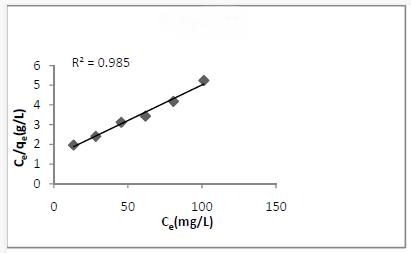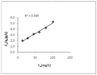 The plot of Ce/qeVs Ce for the dye used was linear (Fig.5). The fact that the Langmuir isotherm fits the experimental data very well may a homogeneous distribution of active sites on the adsorbent surface [8]
