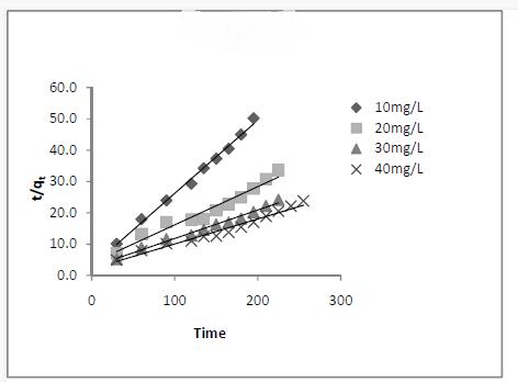 The adsorption may also be described by pseudo second order kinetic model [10]. The linearised form of the pseudo second order model is, t/q t =1/k 2 q e 2 + t/q e k 2 – rate constant of second order adsorption (g/mg/min)
