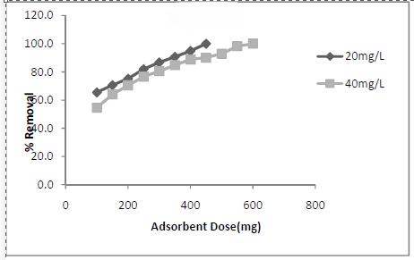 Adsorbent dosage is an important parameter as this factor determines the capacity of an adsorbent for a given initial concentration of the adsorbate. The effect of adsorbent dosage on basic dye removal was studied by keeping all other experimental conditions constant. The results showed that as the adsorbent concentration increased, the amount adsorbed per unit mass of the adsorbent decreased considerably[5](Fig.3).