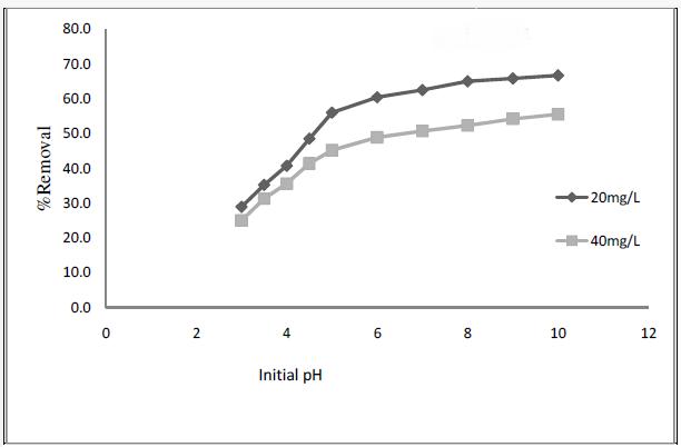 Effect of pH on adsorption of Basic Fuchsin was investigated. The results are shown in Fig.4 indicate that the percent removal increased with increase in pH [6].