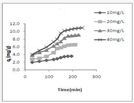 The results ofvariationofadsorptionofBasic Fuchsin withcontact time are showninFig.2.The results revealed that,percent adsorption decreased with increase in initial dye concentration,but the actual amount of dye adsorbed per unit mass of the adsorbent increased with increase in dye concentration showing due to that the adsorption is highly dependent on initial concentration of dye[4]