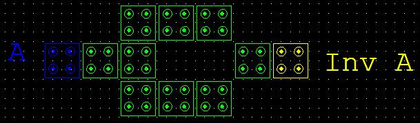 Inverter: Two diagonally aligned cells will have the opposite polarization. Henceforth, inverters can be implemented with lines of diagonally aligned cells. An example of a QCA Inverter is as shown in Figure