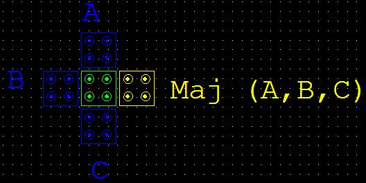 Majority Gate: Majority Gate (MV) is the fundamental logic block in any QCA design. A majority gate can be built with the help of five cells. The top, left and bottom cells are inputs. The device cell in the centre interacts with the three inputs and its result (the majority of the input bits) will be propagated to the cell on the right. An example of an MV representation in QCA is as shown in Figure 5. The logic function implemented by the MV is