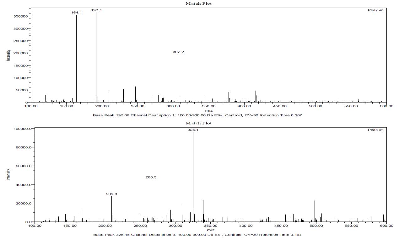 Lignad (–) Ph-NH-CO peak = 164.1 amu (ES+)