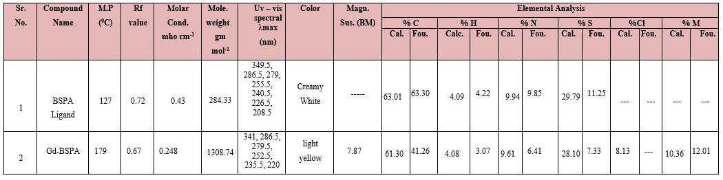 The physical data of the complex and ligand are presented in the table no.2. The Gd(III) complex was colored while BSPA is colorless. The melting point of ligand is different than the complex. The TLC of solid was carried out using silica gel as the stationary phase and toluene : methanol (7:3) as the mobile phase. The Rf value of complex are different than ligand. Together, all these provide confirm formation of single complex in each case. The molar conductance of complex confirms that are quite low and these complex are nonionic.