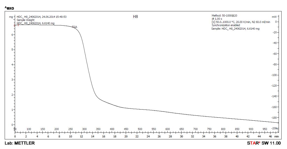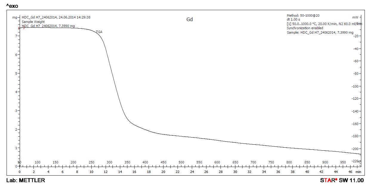 The reported values for Gd-BSPA are based upon the results of complexes without water of crystallization When thermal analysis was carried out, the sample, because of its hygroscopic nature, absorbed water molecules from air and all the corresponding results were uniformly lower than anticipated. Therefore, the results have been expressed for the complex on dried basis. This hygroscopic complex was dried at 50 0C for 90 minutes in oven to remove absorbed water.