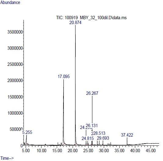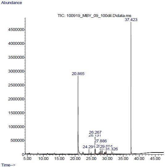 Another above graph indicates the fatty acids profiles of lipids showed saturated fatty acids, such as Tridecanoic acid, 12methyl-, methyl ester (1.331%), Pentadecanoic acid, methyl ester (4.593%), Tetradecanoic acid, 12-methyl-, methyl ester