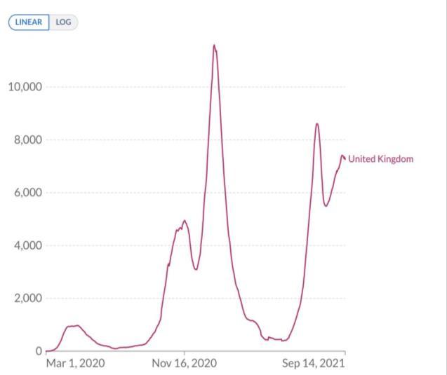 England faced a new outbreak on 11 June 2021, 1,079.91 people per 1 million people. As of 13 September 2021, 7,344.97 per 1 million people were infected with the rate of infection went up by 5.8 fold. On 11 June 2021, the number of COVID-19 deaths was 1.74 per 1 million people. By 13 September 2021, there were 18.25 deaths of COVID-19 patients per 1 million people as the mortality rate increased by 9.488 times. The variant in circulation since the new outbreak was the Delta strain, up to 100% [4]. The main vaccines approved were AstraZeneca and Pfizer [12].