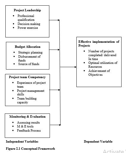 A conceptual framework gives the research an overview of how various issues in the research work are conceived, and their relationships (Yin, 2013). In this studythe dependent variable is the effective implementation of Public Health Construction projects while the independent variable is; project leadership, budget allocation, project team competency and monitoring and evaluation. The conceptual framework is showed in Figure 2.1