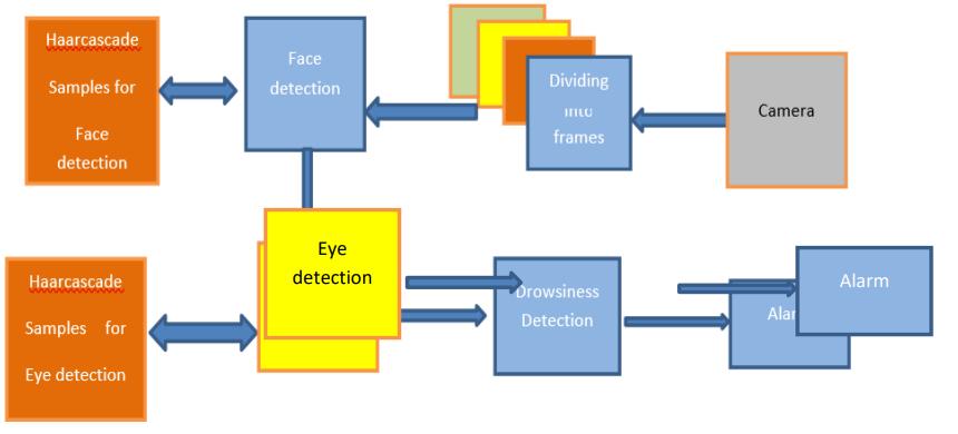 Various different types of methods for measuring the drowsiness of the driver are mentioned which includes Vehicle based measures, Physiological measures, Behavioural measures [3]. Using these methods an intelligence system can be developed which would alert the driver in case of drowsy condition and prevent accidents. Depending on advantages and disadvantages the most precise method is chosen and proposed. Then the working for entire system development is explained. Then each frames are analysed to find face first. If a face is detected then the next task is to locate the eyes. After the positive result of detecting eye the amount of closure of eye is calculated and compared with the reference values for the drowsy state eye. If drowsy condition of driver is found out then driver is alarmed else repeatedly the loop of finding face and detecting drowsy condition is carried out [4]