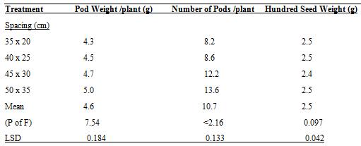Pods weight per plant= Pods weight per plant was determined by weighing the pods per plant from 10 stands per plot and the average was determined.
