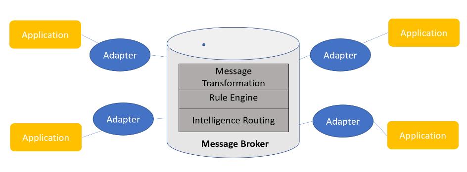 The second generation of EAI is the centralized integration platforms which is known as message broker. In this integration approach, the message broker is a central hub that is responsible for data transformation and routing. It uses adapters to connect all systems to a hub to transfer messages and convert data formats to a format that the hub can understand. Sender application publishes messages to a message broker, message broker in turn process the message by applying data transformation. Then, the broker routes the message to the receiving application. Both sender and receiver does not have to be presented during this process and they can stay anonymous to each other [1][2]. Message broker can support different transmission patterns like one to many, many to one, publish/ subscribe and request/ response [3]. Message brokers as shown in Fig. 2 consists of three components: message transformation which handles the transformation of message content from the sender format to the receiver format. Intelligence routing which involves identifying incoming messages and sending them to the right receiver after processing the message, and the rule engine which provides capabilities to control the distribution of messages and allow dynamic routing decision [1].
