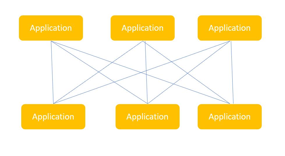 The first generation of EAI involves the use of point-to-point middleware which provides APIs or program interfaces to link one application to another using message queuing technology such as Common Object Request Broker Architecture (CORBA) or remote procedure calls (RPCs). The point-to-point middleware embeds the middleware layer into applications, and it requires excessive alteration on both sides to achieve the integration. As the number of point-to-point integrations increases in an organization, it becomes unmanageable and very difficult to track. Also, the development cost of maintenance and adoption of new changes on existing point-to-point integrations is very high as it requires excessive amount of changes to the existing designs [1][5]. Given these limitations of point-to-point middleware, it led EAI to evolve to a different generation that combined different set of technologies to enhance EAI infrastructure. Fig 1 illustrates the complexity of point-to-point integrations.