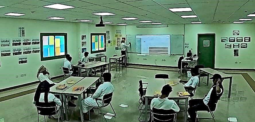 The teacher arrives with some students already seated and begins preparing for the lesson. He displays the attendance register in the middle of the whiteboard and writes the objectives along the side of the board. As shown in Figure 1, the classroom is air-conditioned, well-it, clean, and orderly. Colorful posters with various English words decorate the walls. Windows covered with thin colored paper give a stained-glass effect preventing glare from the early morning sun shining directly into the room. Tables, arranged into three groups, foster and encourage students to easily work in teams and pairs, necessitated by the fact that there were not enough textbooks for each student. The students sit quietly, with their books closed waiting for instructions from the teacher.